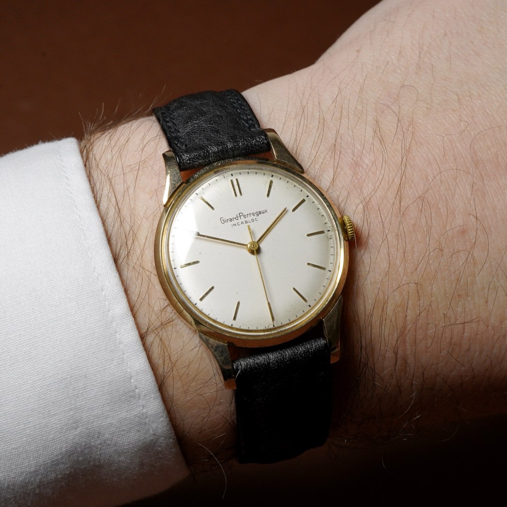 We are delighted to offer this beautiful vintage Girard Perregaux watch for sale. Girard Perregaux are one of the oldest watchmakers in the industry boasting over 200 years of heritage based in . This dress watch ‘Calatrava-style’ has a hallmarked case dated 1985 and comes in a 33mm wide solid 9ct yellow gold case, which features elegant curved lugs (matching the style of the time). The dial is original with very light patina (around the edges) and is a lovely matte silver colour with contrasting gold pencil-shaped hour markers and slim sword hands. The watch is powered by an Incabloc shock-resistant manual winding mechanism and is protected by a domed gold caseback. It comes fitted on a black vintage-style leather strap with a gold plated buckle. The watch has just been serviced and is sold with a 12-month warranty from the date of sale.