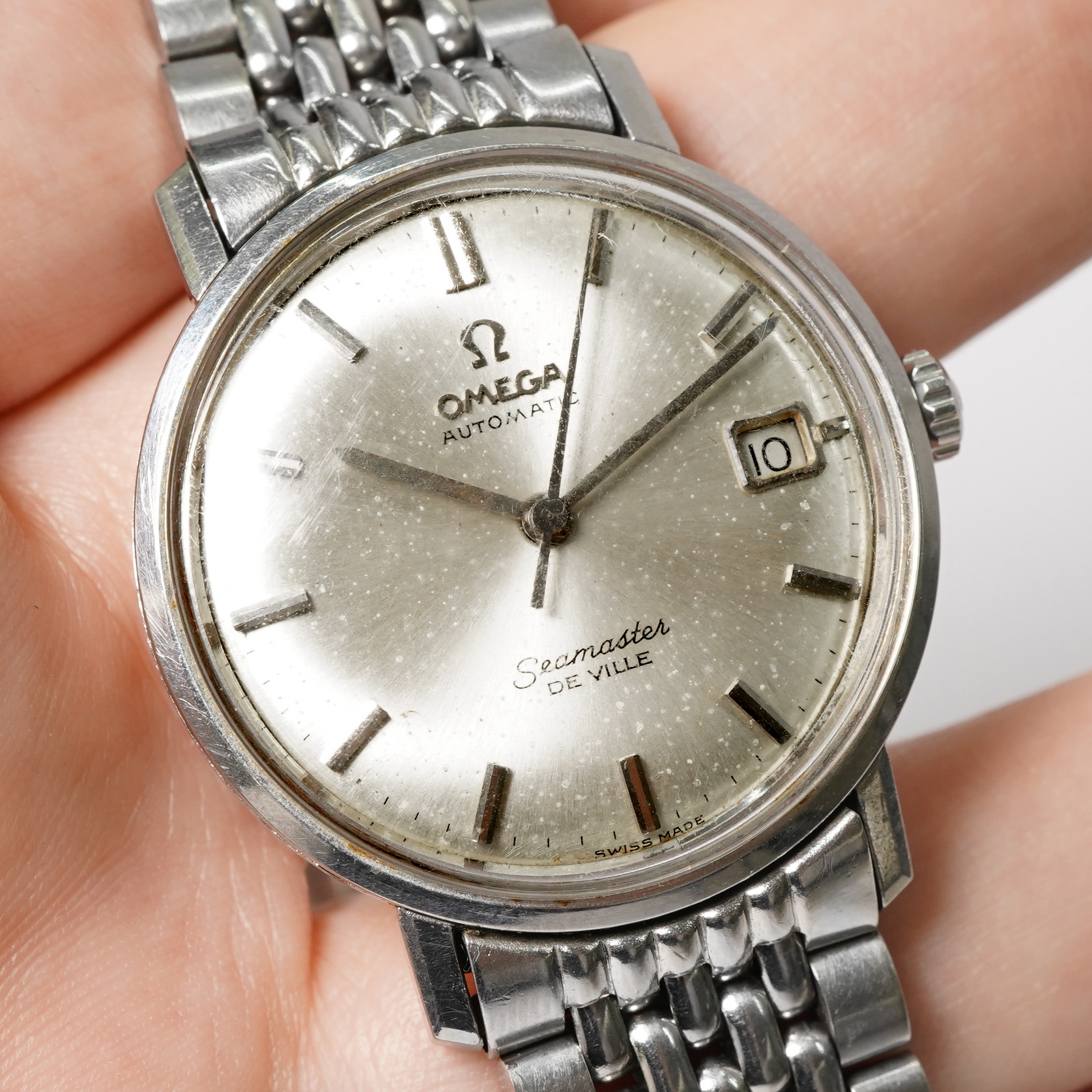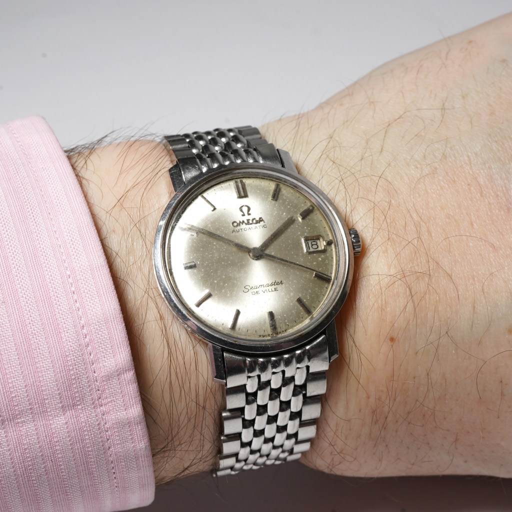 One of my favourite everyday watches, here we have the Omega Seamaster DeVille Ref.14910 SC-62. Presented in a 34mm stainless steel case with a slimmer profile than standard Seamasters, it features a silver suburst dial with even patina, slim silver baton hour markers and sword hands with a date feature at 3 o’clock. It is powered by the Omega automatic calibre 562 movement, housed in a one-piece case and comes fitted on its original matching steel ‘beads-of-rice’ link bracelet with a folding clasp. This watch is from circa 1963.