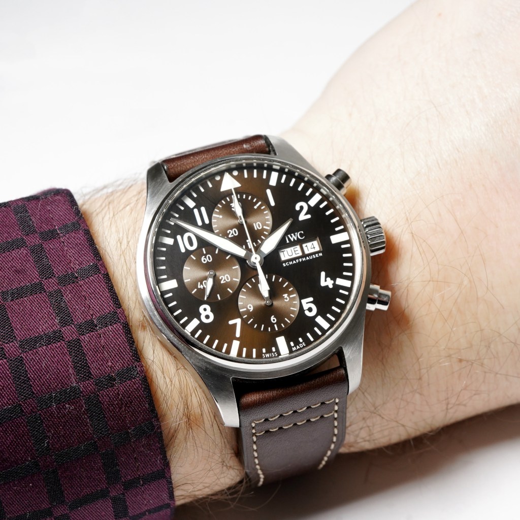 We are proud to offer this stunning IWC Pilots ‘Antoine St Exupery’ Edition watch for sale. Pilot’s watches are the beating heart of IWC Schaffhausen. Trusted by aviators for generations, they are precise, durable, and built to endure the harshest flight conditions. More than mere instruments, they have become the epitome of the tool watch – indispensable both in the air and on land. The IW3777-13 Pilot’s Watch Chronograph Edition “Antoine de Saint-Exupéry” was released by IWC Schaffhausen in 2017 to pay homage to the life and career of the famous humanist, author and french pilot, Antoine de Saint-Exupéry. Featuring a gorgeous sunburst brown dial with full Arabic numerals, day/date aperture and luminous hands. Powered by the IWC automatic calibre 79320 movement and fitted on a matching brown IWC leather strap. Complete with its original box and paperwork dated 2018.