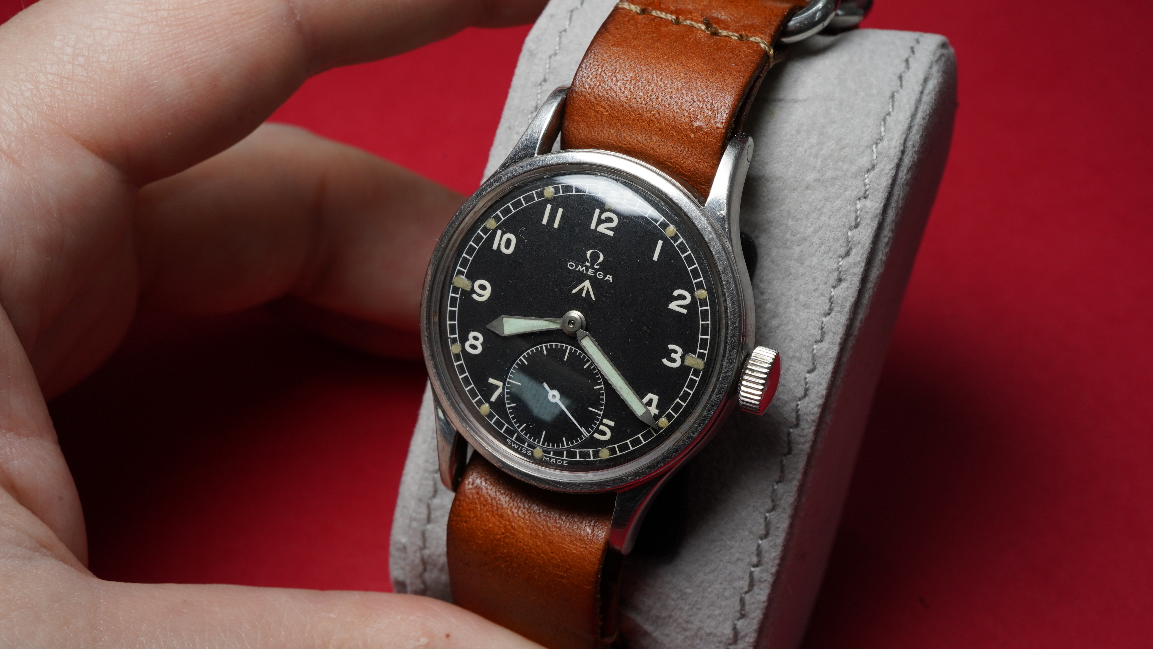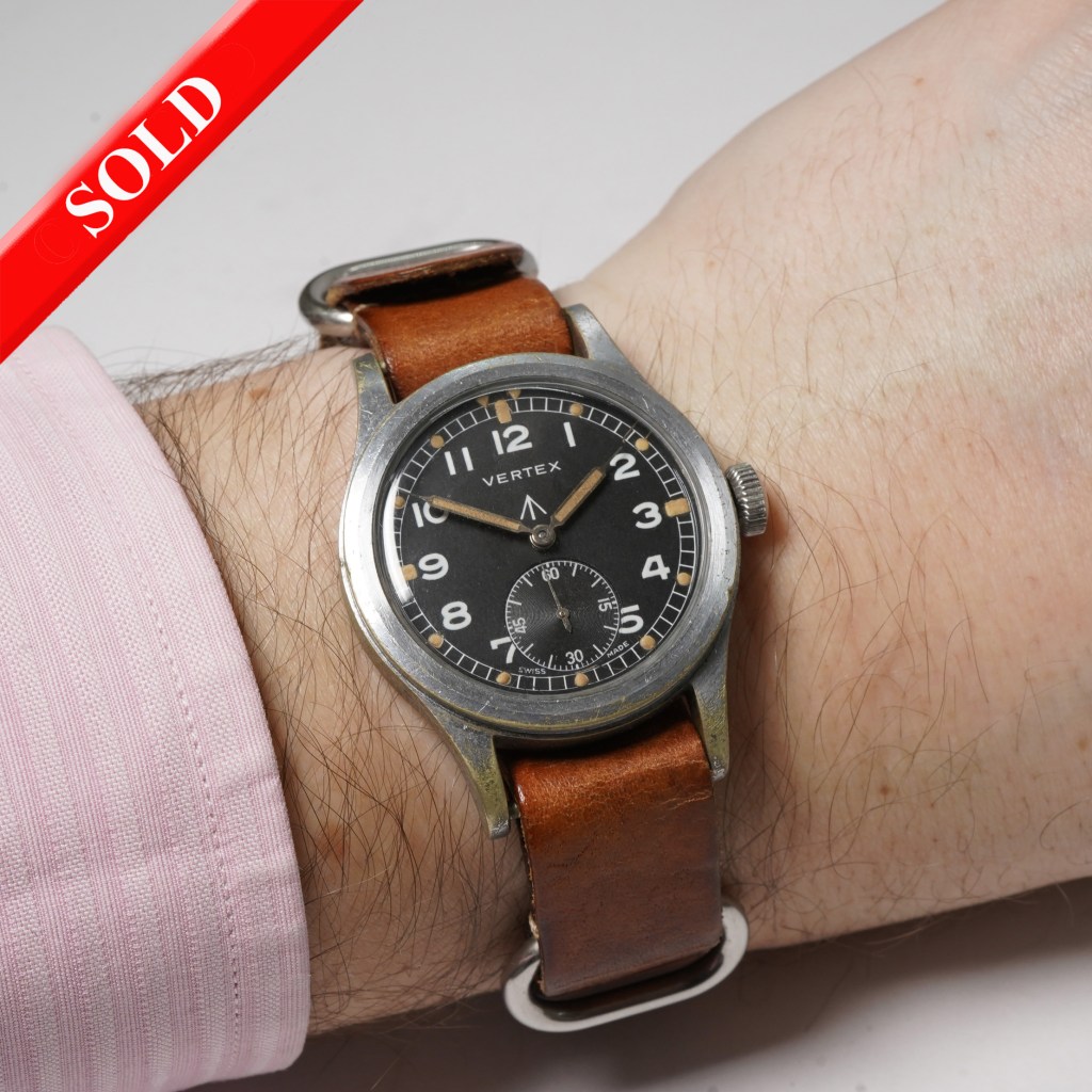 Here we have one of our favourite watches. A 1944 Vertex ‘Dirty Dozen’ WWII watch. Set in an unpolished 35mm chrome-top case with lovely patina, original MOD spec black dial with full Arabic numerals and subsidiary second hand, original pencil hands and protected by an acrylic plexi-glass. Powered by the Vertex calibre 59 manual winding movement with a screw-down caseback and fitted on a brown leather NATO style strap. This model is 1 of only 15,000 ever made and is a genuine military collectable. For more information please read this guide…..https://www.hodinkee.com/articles/delve-deeply-into-the-dirty-dozen