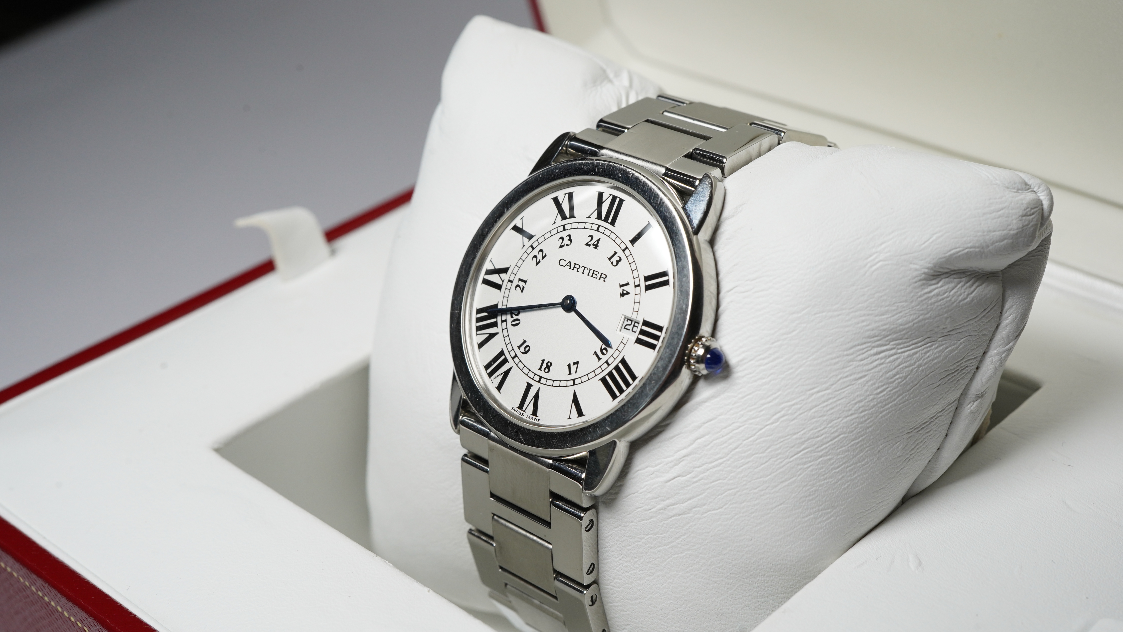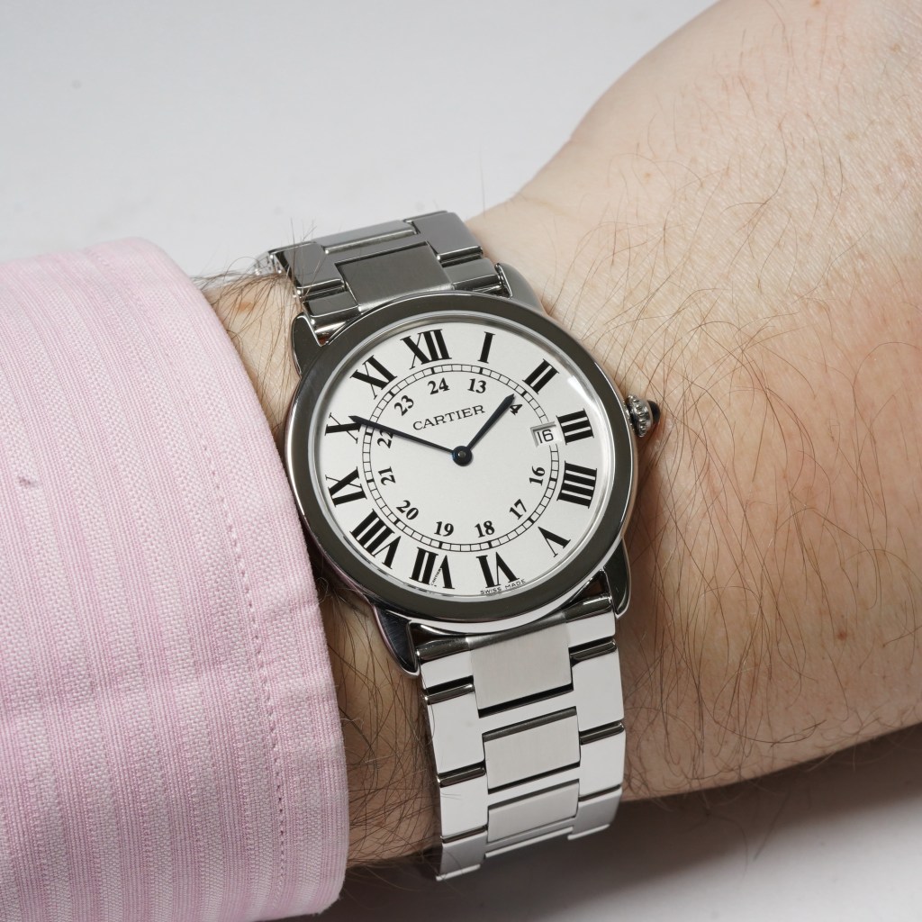 We are proud to present this stylish modern Cartier Solo Ronde watch Ref.2934. Set in a polished 36mm stainless steel round case with a smooth bezel, silver brushed dial with black printed Roman numerals around the outer chapter ring and 24hour Arabic numerals inside the minute track with a date feature at 3 o’clock. Protected by a domed sapphire crystal glass and powered by a quartz Cartier mechanism and fitted on a matching polished steel bracelet with a dual concealed folding clasp. Complete with its original Cartier box and paperwork dated 2011. Now Discontinued