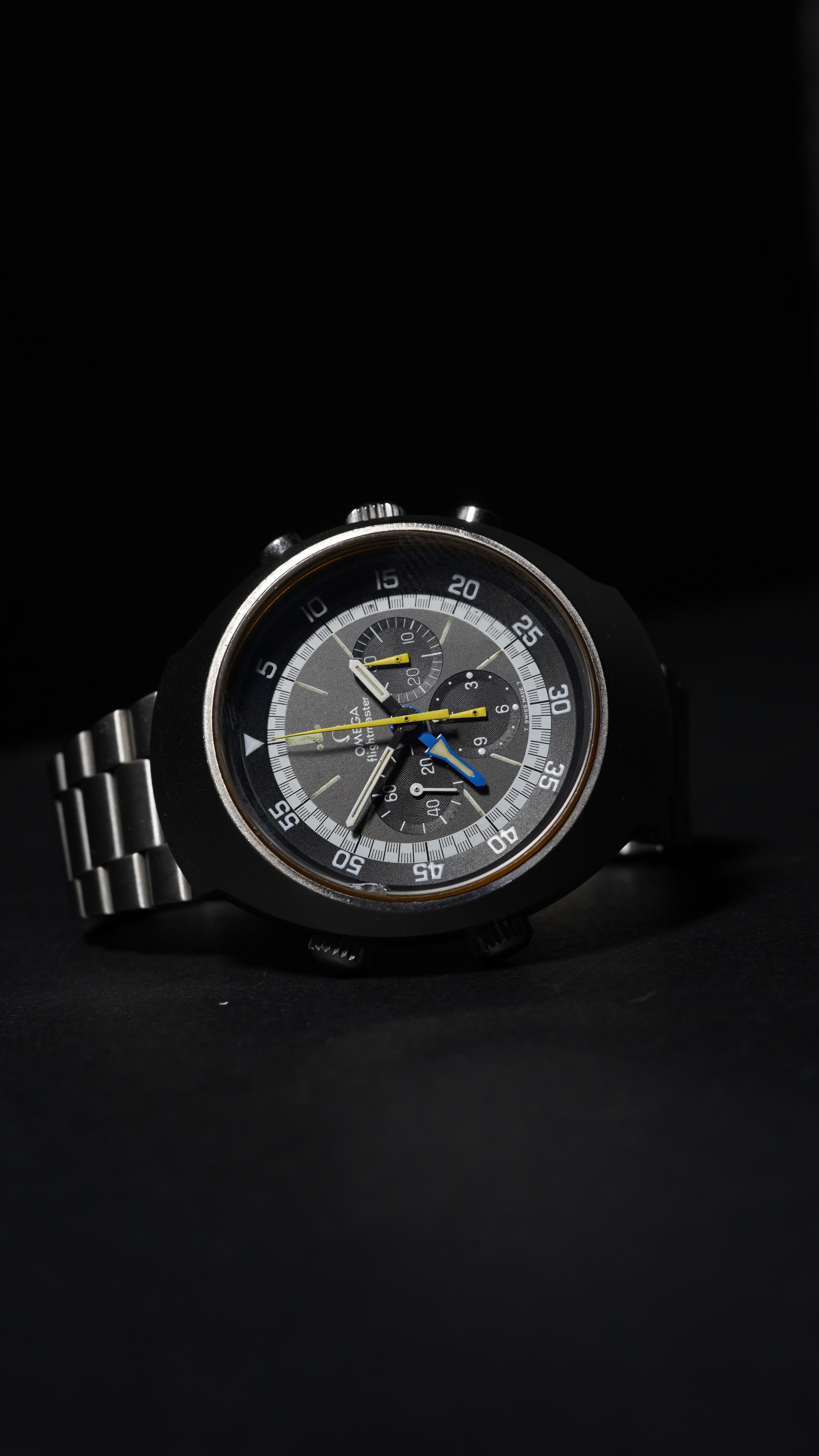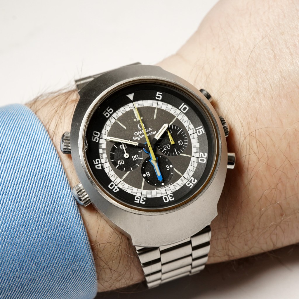 Here we have one of our favourite Omega’s, the vintage Flightmaster Mk II chronograph ref.145.036! Set in a very 1970’s style over-sized case, it was one of the first Omega watches to be fitted with a sapphire crystal glass (chip at 10 o’clock/can be replaced). It has its original grey dial with patina, with contrasting black chrono sub-dials at 3/6/9 o’clock and original hands. The Chronograph hands are the cadmium yellow colour and there is an inner rotating bezel and additional blue ‘rocket’ hand for time-zone setting. Powered by the Omega manual calibre 911 movement, which is protected by a screw-down crown with flightmaster engraving (faded) and fitted on a matching steel Omega bracelet with folding clasp. This watch is part of a strong aviation heritage within Omega and would be an incredible piece for any collector. Original Omega box included.