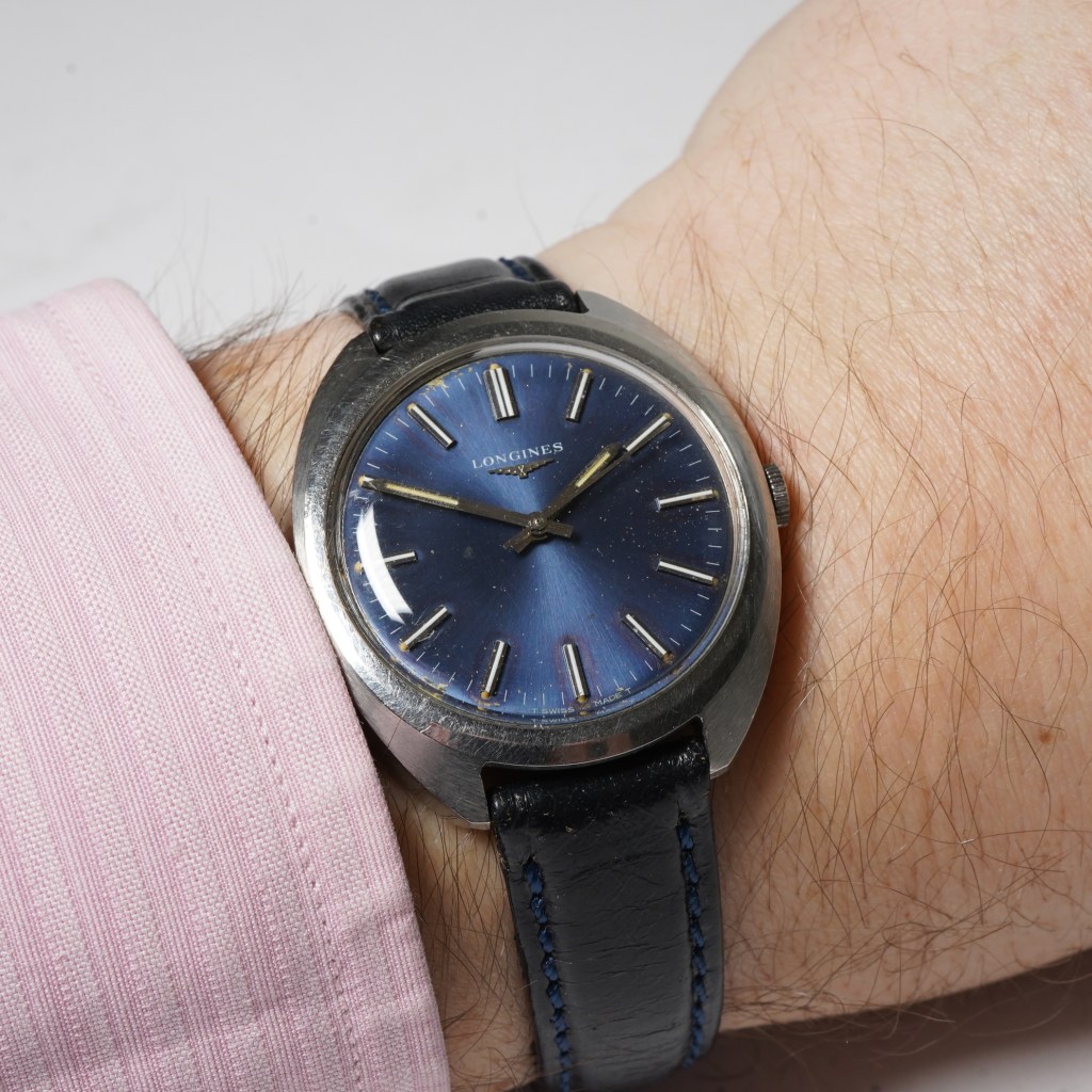 We are delighted to offer this striking vintage Longines Conquest watch ref.1500. It comes set in a 34mm stainless steel ‘barrel-shaped’ case with a stepped bezel, original blue sunburst dial with patina, applied baton hour markers and sword hands. Protected by a domed acrylic plexi-glass and powered by the Longines manual winding calibre 706 movement with a screw-down caseback and currently fitted on a matching blue leather strap. Circa 1974.