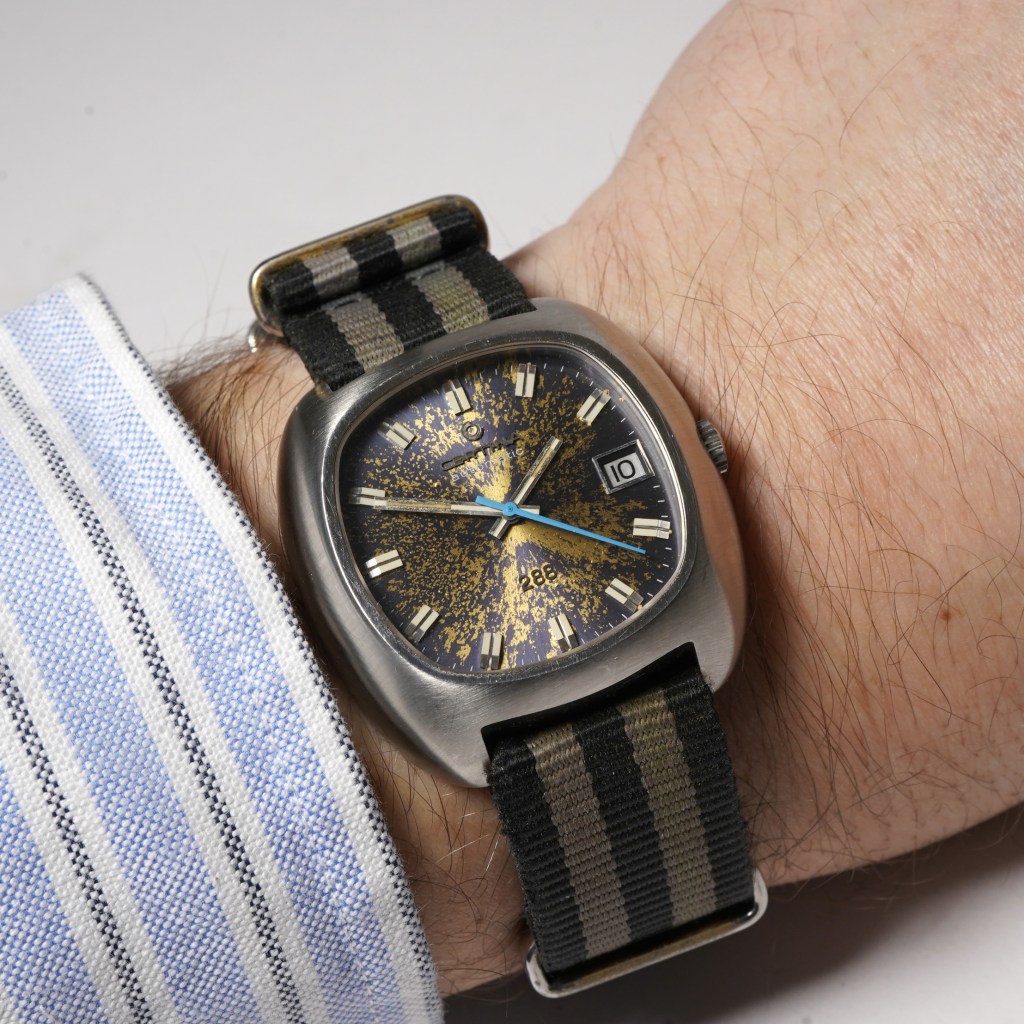 We are delighted to offer this stylish Certina Certidate ‘288’ Ref.5801.800 from circa 1970/71. Set in a brushed satin-finished 34mm stainless steel barrel-shaped case with its original petroleum grey dial, which over 50 years has aged to form this stunning ‘cosmic’ effect. It has chunky block hour markers and hands with a striking blue sweeping second hand and is fitted with a flat mineral crystal glass! (rare for a watch of this age). It is powered by a high beat 28800 bph automatic movement (calibre 25-671) with a screw-down caseback and is currently on a striped nylon NATO strap.