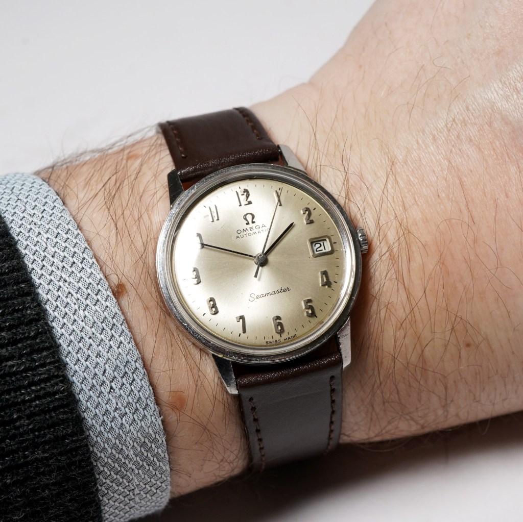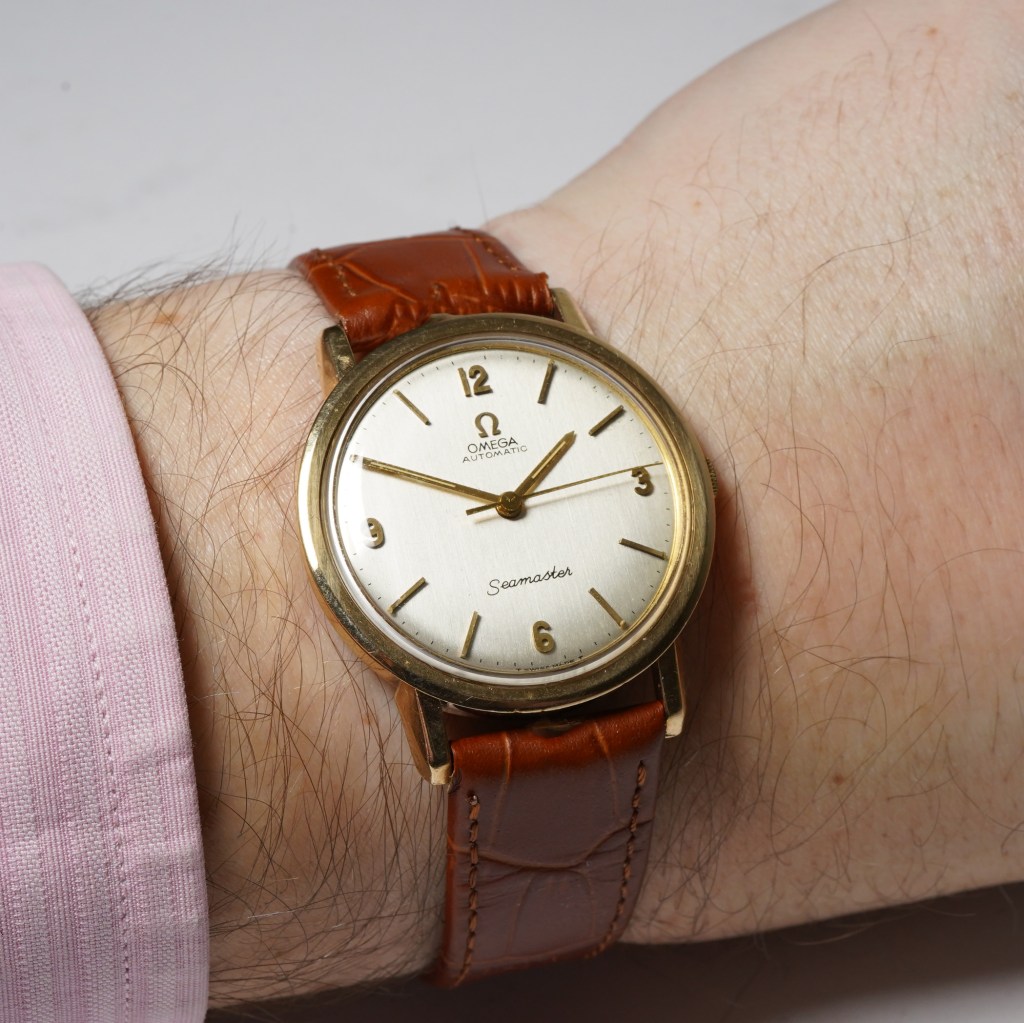 Here we have a stylish Omega Seamaster Ref.165/3-5003 in a solid hallmarked 9ct yellow gold 34mm case. The dial is a vertical brushed oyster colour with applied gold baton and quarter Arabic numerals. It is powered by the Omega automatic calibre 552 movement and is protected by a screw-down caseback with the embossed Seamaster Hippocampus emblem and is fitted on a brown leather strap. This Seamaster is from circa 1964.