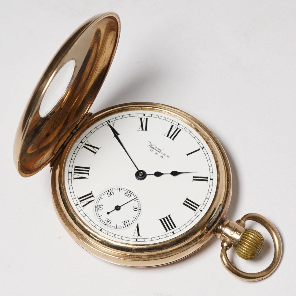 Here we have a stunning solid 9ct yellow gold vintage Waltham Half-Hunter pocketwatch. Set in a Dennison made case, hallmarked 1925 (100 years old this year!), measuring 48mm across and powered by a manual winding movement with elaborate bridge decorations. The dial is original and unblemished with full Roman numerals and blue-steel hands with a subsidiary second hand at 6 o’clock.