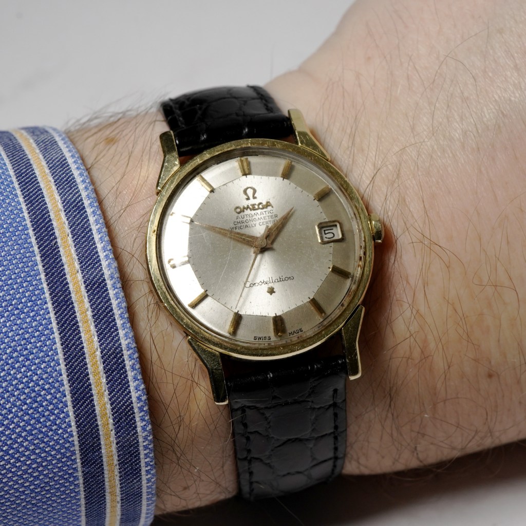 We are proud to present this iconic Omega Constellation with the ‘Pie-Pan’ dial ref.168.005. Set in a gold capped (layer of gold on-top of a steel case) case with the striking ‘dog-leg’ lugs and sunburst finished dial with applied gold baton hour markers and dauphine hands with a date aperture at 3 o’clock. Powered by the Omega automatic calibre 561 chronometer movement, which is protected by a screw-down caseback featuring the observatory emblem. Fitted on a black leather strap. This Constellation is from circa 1963 and would be a perfect gift for any occasion.