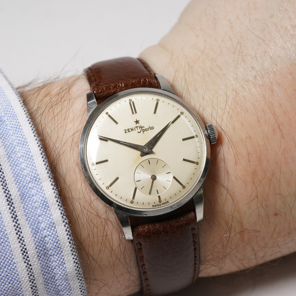 Here we have a stylish early 1950’s Zenith Sporto watch for sale. This Sporto is set in a 34mm polished stainless steel case with a matching smooth bezel, original off-white dial with dauphine hands and a sub-second dial at 6 o’clock. It is powered by the Zenith manual winding calibre 126-6 (sub seconds with Incabloc protection) and is protected by a snap-on caseback. Fitted on a brown leather strap with a steel pin-buckle.