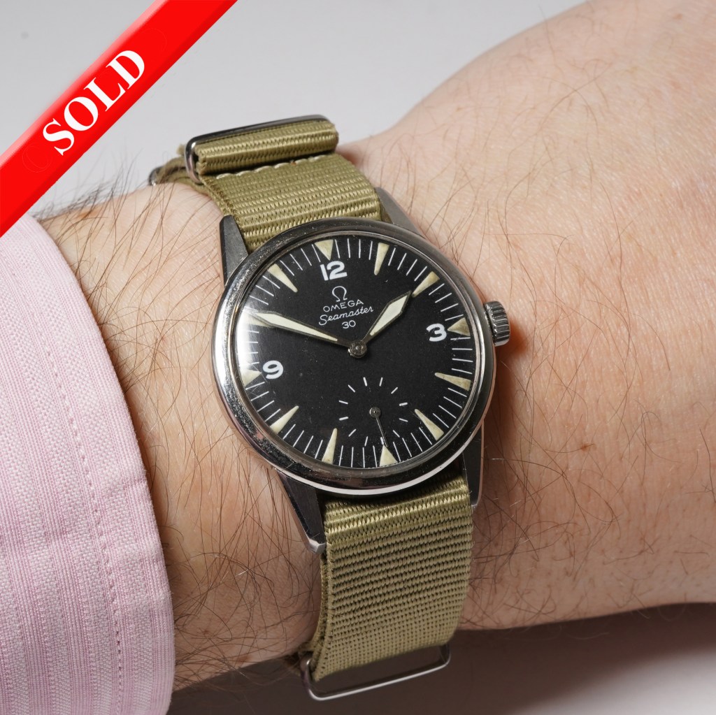 We are delighted to offer this 1959 vintage Omega Seamaster watch Ref.14391-1 with a 34mm stainless steel case. It has been fitted with a later ‘Military-style’ dial following on from the iconic WWII ‘Dirty-Dozen’ watch in 1944. It features quarter Arabic numerals, sabre hands with a subsidiary second hand at 6 o’clock. Powered by the Omega manual winding calibre 268 movement with a snap-on caseback and currently fitted on an olive green NATO style strap.