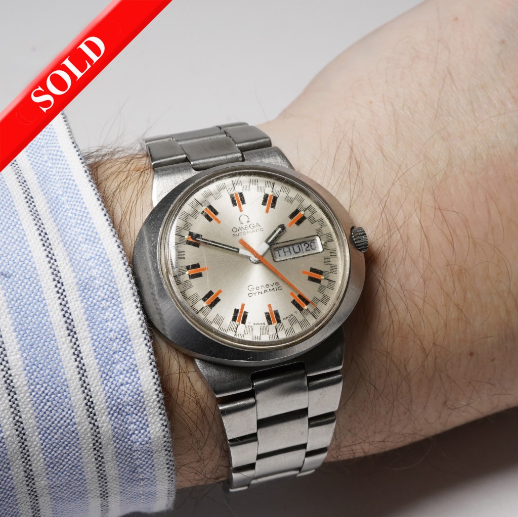 We are proud to present this rare version of the Omega Dynamic ‘Racing Dial’ watch Ref. 166.0079 from circa 1969. Set in a radial brushed 40mm oval-shaped case for ergonomic wrist-feel with the unusual silver sunburst dial with striking black/orange hour markers, orange sweep-second hand, inverted black/white hands and day/date feature at 3 o’clock. Powered by the Omega automatic calibre 752 movement, protected by a screw-down caseback and fitted on its original steel Omega bracelet with folding clasp.