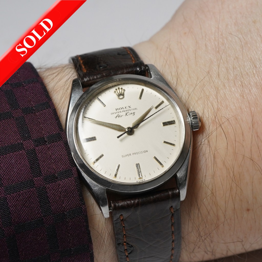 Here we have a classic Rolex Air-King watch ref.5500 from circa 1960. Released in the midst of World War II, the Rolex Air-King is the only remaining watch in production from the original “Air Series.” Released in 1945, the Air-King joined the ranks of the Air-Lion, Air-Giant, and Air-Tiger, all created to honour the RAF pilots of the Battle of Britain. Set in a 34mm stainless steel Oyster case with a clean, legible cream coloured dial with applied baton hour markers and spear-shaped hands. This version the ‘Super Precision’ uses the Rolex automatic winding calibre 1530 with ‘butterfly rotor’ (rather than the standard 1520) and comes fitted on a brown ostrich leather strap.