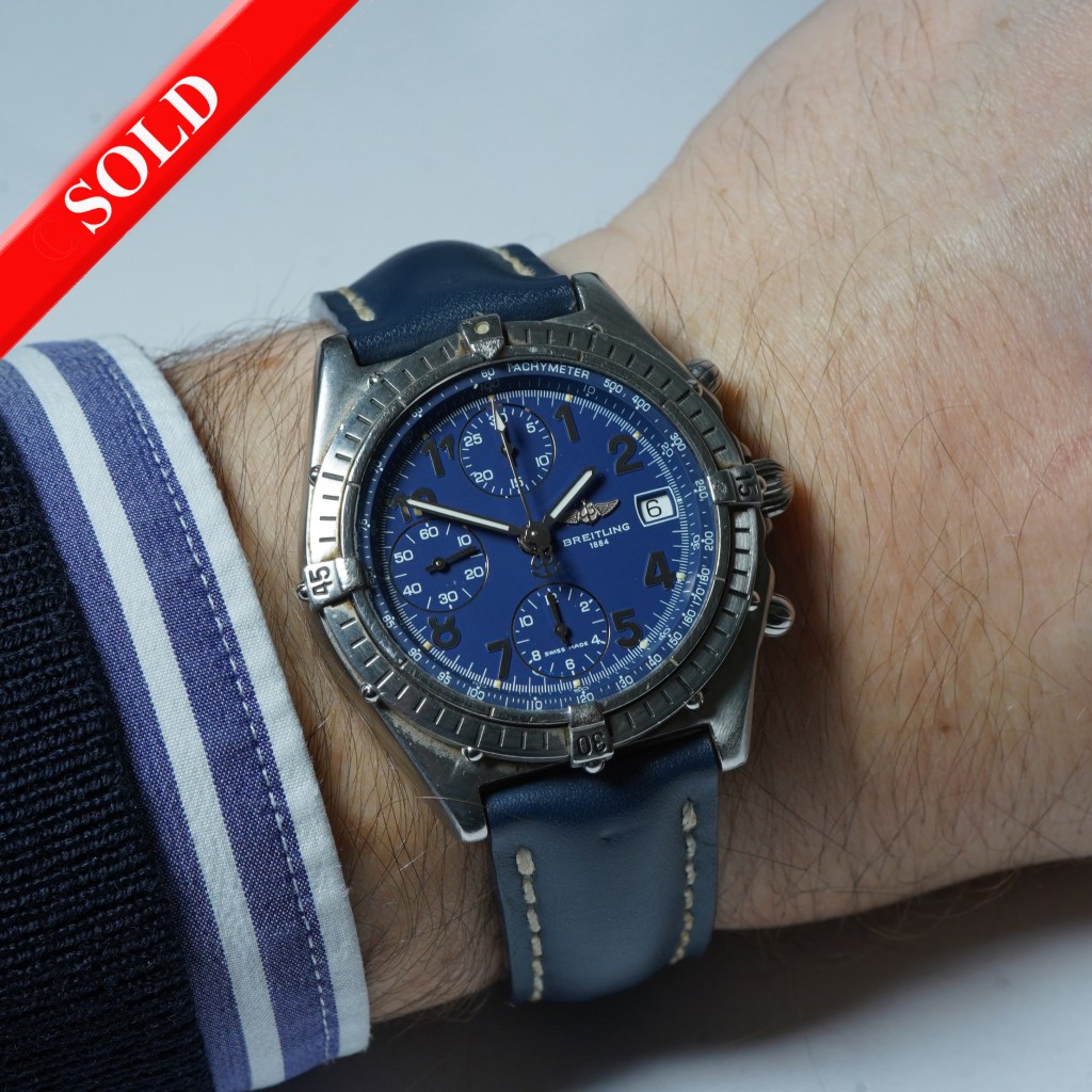 Here we have a stylish Breitling Chronomat watch ref.A13047 from circa 1997. The Breitling Chronomat is a watch that has withstood the test of time. This moddel was worn in World War II, withstood the quartz crisis, was reinvented during the 1980s after the company went under and today is recognized as one of the brand’s most popular and beloved watches. Set in a 39mm stainless steel case with a uni-rotational bezel featuring quarter ‘riders’ and a striking blue dial. Full Arabic numerals, triple chronograph sub-dials at 12/9/6 with a date aperture at 3 o’clock and a dual decimal and tachymeter chapter ring, protected by a domed sapphire crystal glass. Powered by the Breitling modified Valjoux 7750 base automatic chronograph movement, which is protected by a screw-down caseback featuring the Breitling logo in gold relief and fitted on a matching Breitling blue leather strap with a Breitling steel pin buckle.
