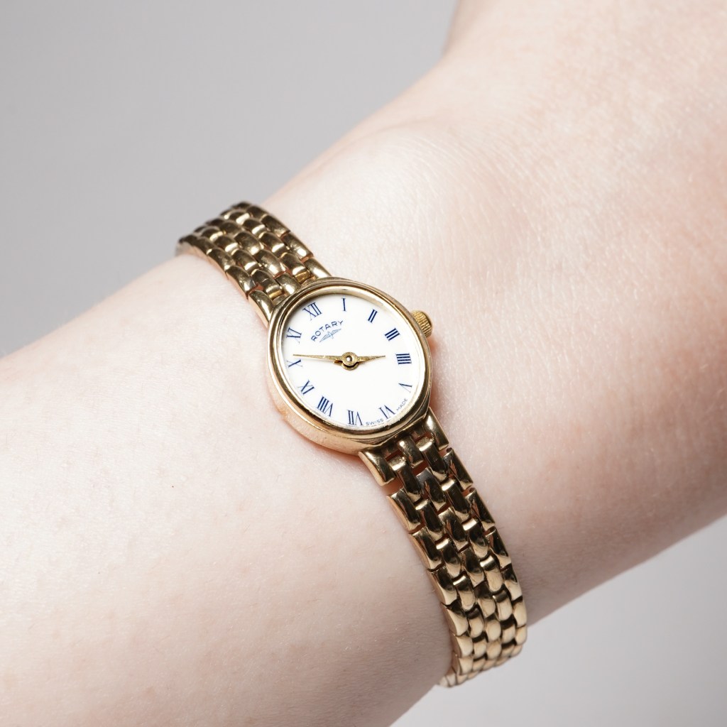 We are proud to present this stylish ladies pre-owned Rotary gold watch from circa 1990’s. Set in a 17mm x15mm 9ct yellow gold oval shaped case with a clean white dial with blue printed full Roman numeral hour markers and gold hands. Fitted with a flat sapphire crystal glass, powered by a quartz (battery) mechanism and fitted on an integral gold link bracelet with folding ladder clasp. Length: 6.5″, weight: 16.3g. Complete with its original Rotary box