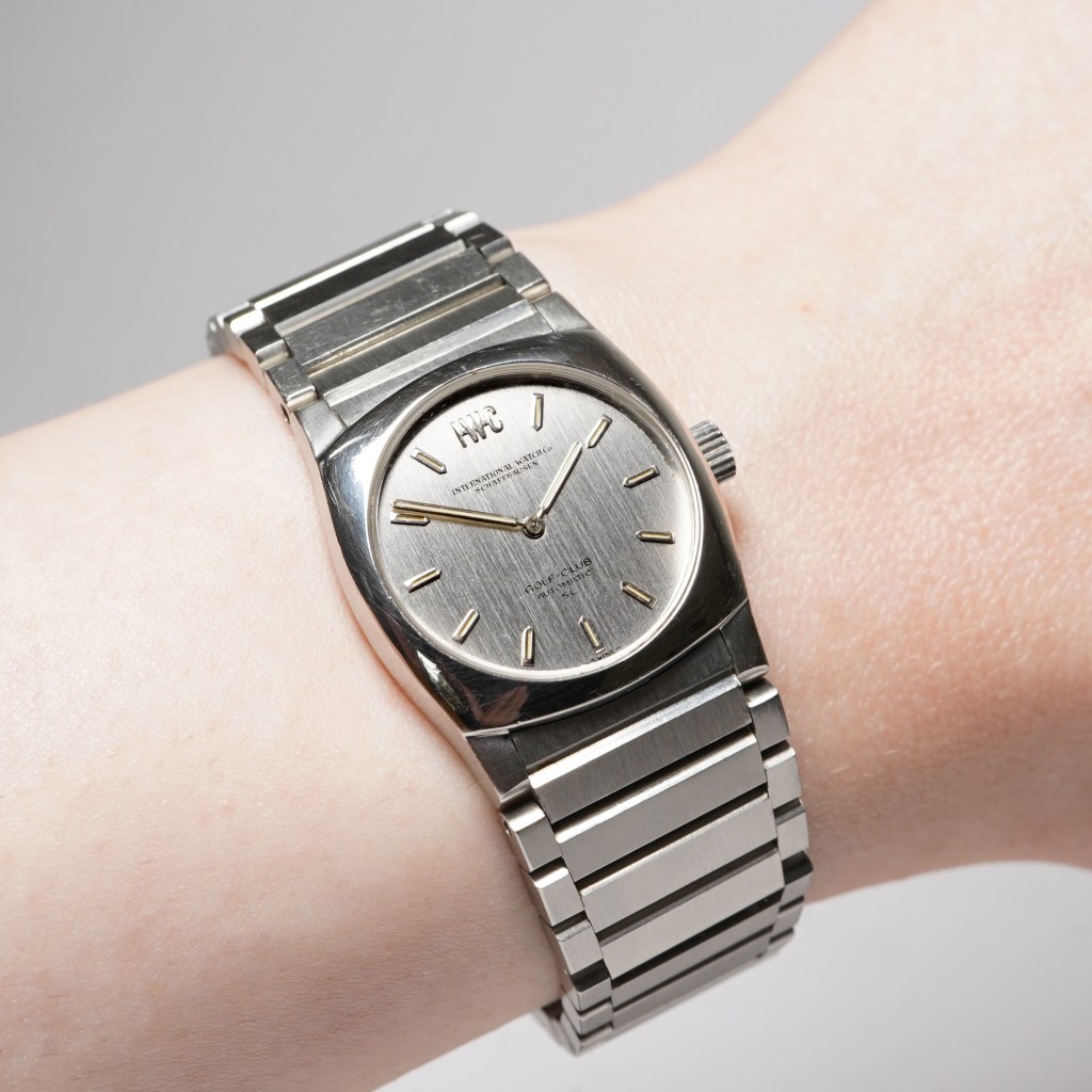 We are proud to present this genuinely rare ladies vintage IWC Golf Club automatic watch. The IWC Golf Club was launched along with the redesigned Ingenieur and Polo Club in the mid 70s under the “SL” collection. The “SL” collection was created for the younger, more cutting-edge and active persons who engaged in recreational activities. The “SL” collection wasn’t well received and production was killed off within a year or two. This resulted in a small production number of around 1000 for the whole Golf Club SL collection. Set in a 26mm steel cushion-shaped case with a brushed silver dial, powered by the automatic calibre 442 movement on an integral steel bracelet.