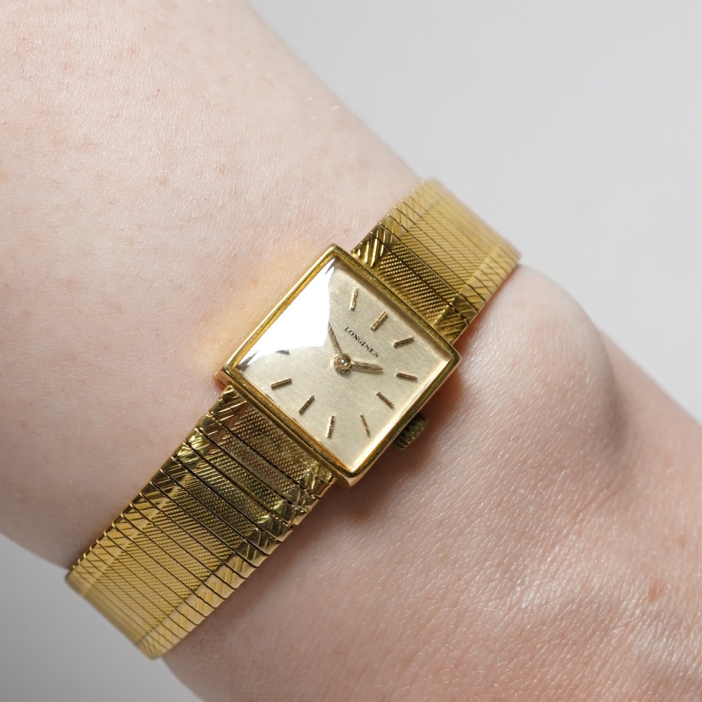 We are proud to present this stylish ladies vintage Longines 9ct yellow gold dress watch. Set in a 17mm square-shaped case with a horizontal-brushed dial and gold applied baton hour markers and hands. Powered by a Longines manual wind movement calibre 410. Case is hallmarked date 1966 and the integral textured bracelet has a ladder folding clasp. Length: 6.5″, weight: 30g