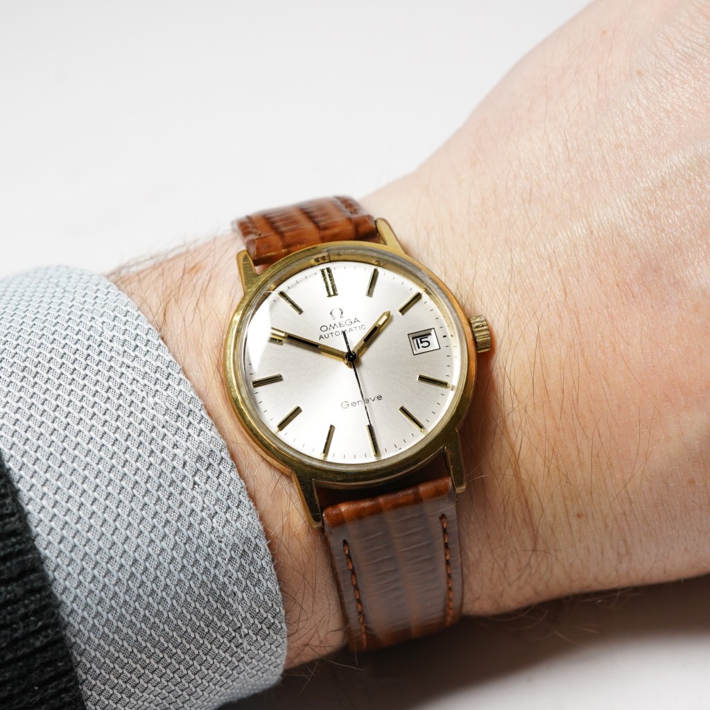 We are proud to present this stylish, classic Omega Geneve watch for sale. Set in a 34mm round gold plated case with a silver sunburst dial featuring applied black/gold baton hour markers and matching hand-set with date feature at 3 o’clock. Protected by a domed acrylic plexi-glass and powered by an automatic Omega calibre 1012 movement with a screw-down caseback and finished on a brown leather strap (alternative straps available). This model is from 1973 and would be a great everyday wearer.