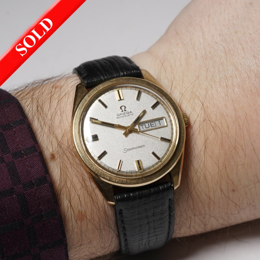 Here we have a stunning solid gold ‘Jumbo’ Omega Seamaster watch ref.166.503-2 from circa 1968. Set in a large 36mm (compared to the usual 34mm) solid 9ct yellow gold hallmarked case with a radial brushed bezel, silver ‘stardust’ dial with applied black/gold block hour markers and matching sword hands and a day/date aperture at 3 o’clock. Powered by the Omega automatic calibre 752 movement, protected by a gold screw-down caseback with embossed hippocampus emblem and fitted on a black leather strap.
