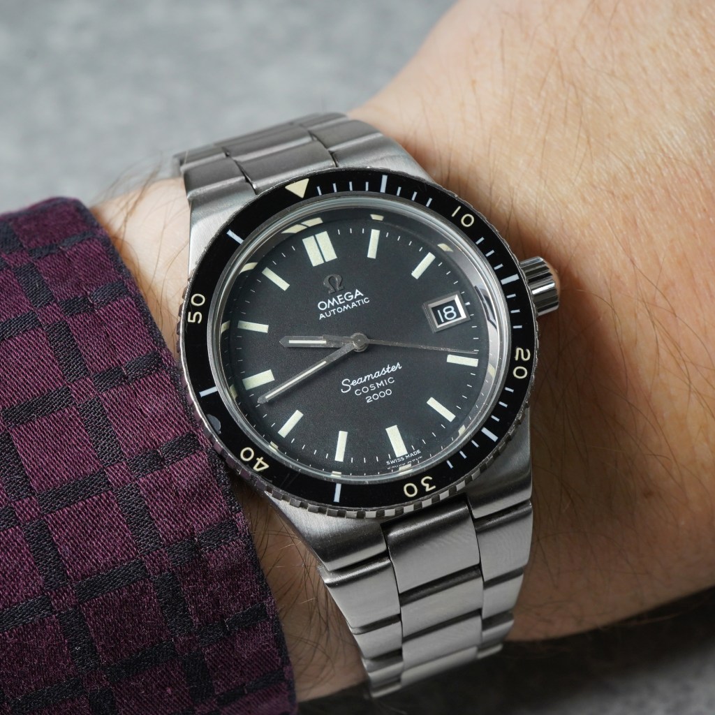 We are proud to present this stunning example of a rare vintage Omega Seamaster Cosmic 2000 ‘Divers’ watch ref. ST 366.0827. Set in a brushed 38mm stainless steel case with a slim black ‘bakelite’ divers bezel with beautifully aged lume, original charcoal grey dial with date aperture at 3 o’clock and protected by a flat mineral glass. Large, screw-down crown and powered by the Omega automatic calibre 1012 movement protected by a plain snap-on caseback. Fitted on an integral steel bracelet with an Omega folding clasp. Complete with its original Omega box and paperwork dated September 1974.