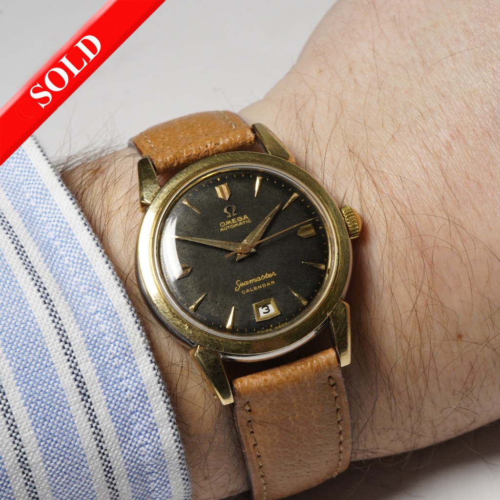 We are delighted to offer this stunning Omega Seamaster ‘Calendar’ watch from 1954 Ref.2627-18SC. It comes set in a 34mm ‘gold-capped’ case with ‘horn’ lugs. The dial is original and features even patina, arrowhead hour markers and dauphine hands with the rare 6 o’clock date aperture. Protected by a domed acrylic plexi-glass and powered by the Omega ‘bumper’ automatic calibre 355 movement with a screw-down (plain) caseback and fitted on a brown leather strap.