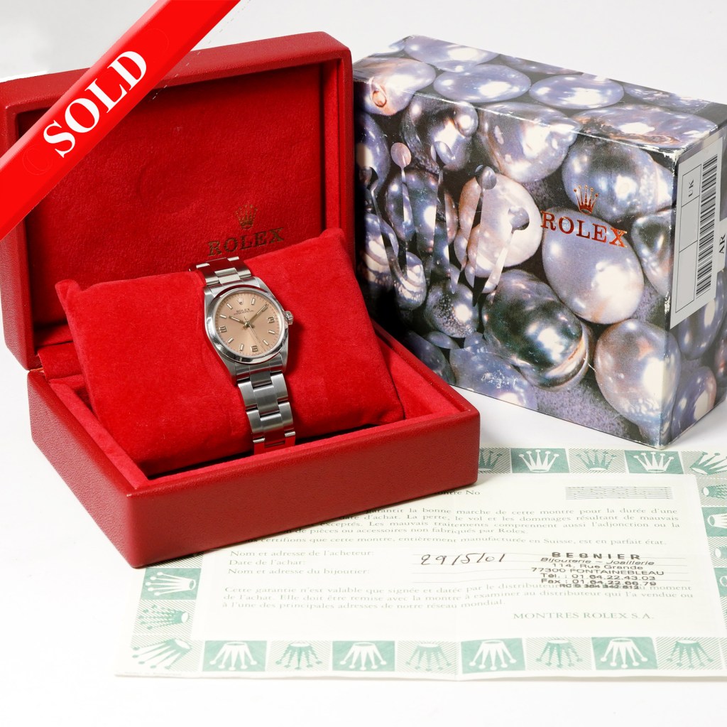 We are proud to present this stylish pre-owned Rolex Oyster Perpetual 31 for sale. The Oyster Perpetual has been a staple of the Rolex brand since 1932 and is the longest running collection within the brand. ‘Oyster’ named after the waterproof case and ‘perpetual’ indicating its automatic self-winding movement. Paired with a stylish salmon-pink dial with quarter Arabic numerals and luminous baton hour markers and hands. Sapphire crystal glass and a screw-down caseback. It comes fitted on the iconic brushed Oystersteel bracelet with a folding clasp and its original Rolex inner & outer boxes and paperwork dated 2001.