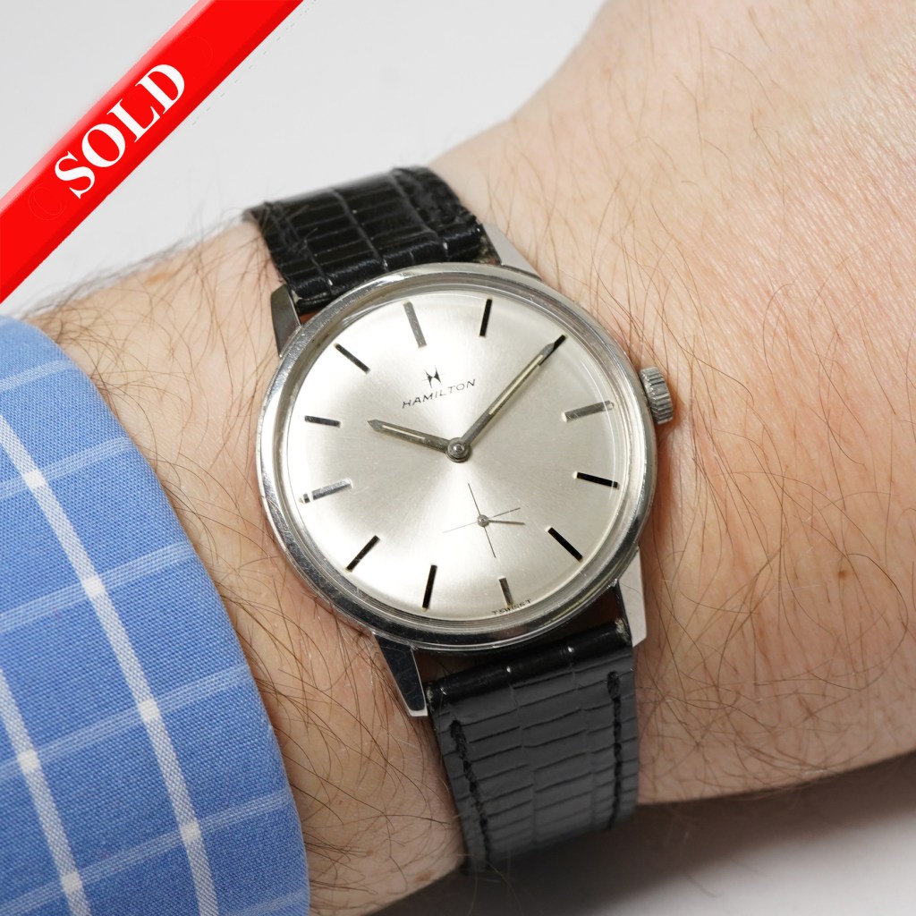 We are proud to present this stylish vintage Hamilton Thinline watch for sale. Set in a polished 34mm stainless steel round case with a slim smooth bezel, sunburst silver dial with applied silver baton hour markers, sword hands and subsidiary second hand at 6 o’clock. Powered by the Hamilton calibre 639 manual winding movement with a screw-down caseback. The watch lives upto its namesake and is only 6mm thick, so wears really nicely on the wrist and is perfect for someone who wants a slim watch.